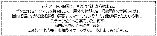 | 公演をお楽しみいただく方への特別なお知らせです。 今回お届けするのは、音楽ライブと謎解きが融合した新感覚のイマーシブ型コンサート。 舞台は、植物と花に囲まれた特別な空間。 通常のライブとはひと味違う、この会場ならではの 体験をお楽しみいただけます。 しかも今回は、“観る” “聞く”だけでは終わりません。 会場内を巡りながら謎解きミッションに挑戦し、物語の世界に入り込むようにライブを体験していただきます。 3つの見どころ ① 植物園ならではの没入体験 植物園内のステージを使った音楽ライブと謎解きが融合した、イマーシブ型コンサートです。普段のライブとはひと味違う、特別な楽しみ方ができます。 また、公演ごとに異なる魅力や発見がある構成になっているため、リピートでのご参加もお楽しみいただけます。 ② 出演者との距離の近さ 一般的なコンサート会場とは異なり、庭園内で花や緑に囲まれながらご観覧いただけます。この会場ならではの近い距離感の中で、出演者をより身近に感じられる演出を予定しています。 さらに謎解きの時間中には、庭園内で繰り広げられるエチュード劇を楽しみながら、出演者たちとの特別な空気感を味わえる構成となっています。 ③ “花”をテーマにした特別な楽曲セレクト 新曲を含め、ハロー!プロジェクトの花や植物にまつわる楽曲を4〜5曲、さらに花にちなんだヒット曲のカバーも披露予定。 全14曲(予定)、この会場でしか味わえない特別なセットリストです。 なお、オープン型公演のためDVD収録はありません。 このライブの感動は、ぜひ会場で直接ご体感ください。 <ご案内> 公演時間は100分〜120分を予定しております。 当日はスマートフォンを使用しますので、必ず充電のうえご来場ください。 園内でいくつかの謎解きミッションに挑戦していただきます。 謎が解けた方から中庭へお戻りいただき、戻られた順にステージ近くへご案内いたします。 |