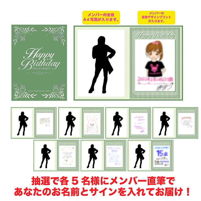 ![]() 抽選で50名様に特典プレゼント♪ 12月通信販売を合計¥8,000以上お買い上げの方の中から抽選で合計50名様に直筆サイン入りスタンド付L判生写真を抽選でプレゼント! 今回は・・・山﨑愛生、有澤一華、福田真琳、江口紗耶、上村麗菜です! *厳正なる抽選の上、当選者の発表は発送をもってかえさせて頂きます。 *体調不良などにより活動に制限がかかったアーティストなどに関して、メンバー直筆の宛名とサインの抽選対象外となる場合がございますので、予めご了承の上お申し込みください。 |