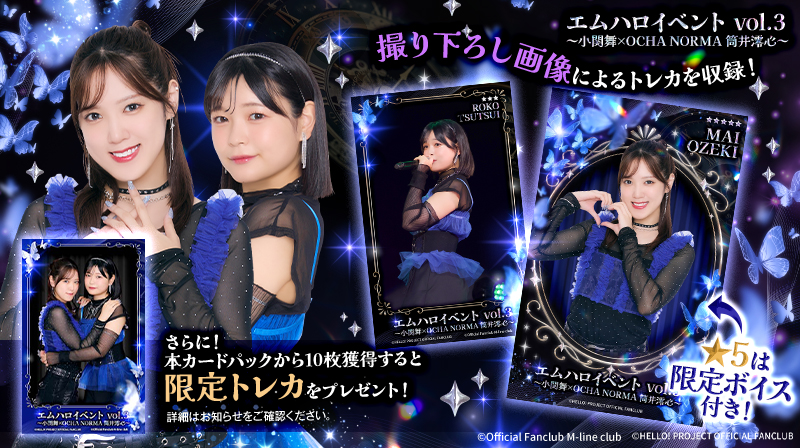 エムハロイベント vol.3 ~小関舞×OCHA NORMA 筒井澪心~の模様を収めた撮り下ろし画像によるトレカを収録したカードパックです。