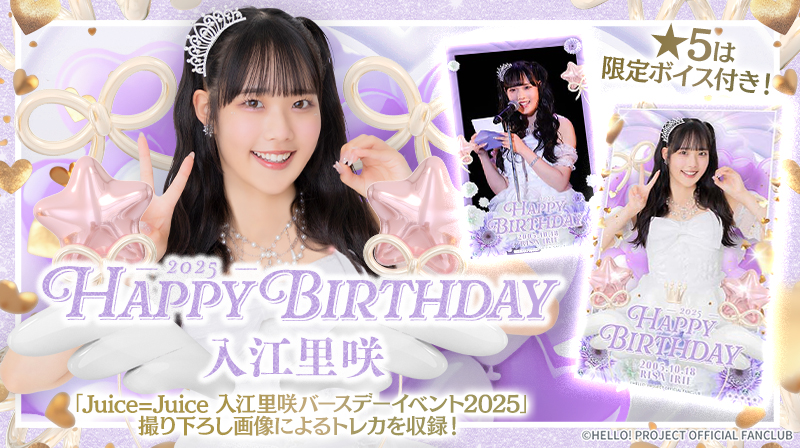 Juice=Juice 入江里咲バースデーイベント2025の模様を収めた撮り下ろし写真などを含むトレカによるカードパックです。