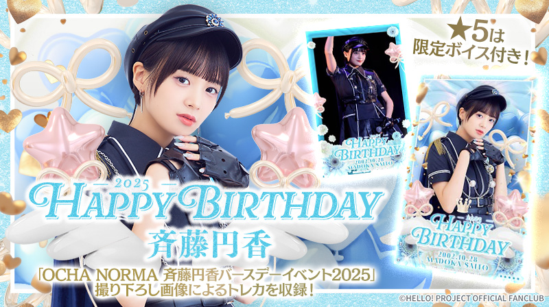OCHA NORMA 斉藤円香バースデーイベント2025の模様を収めた撮り下ろし写真などを含むトレカによるカードパックです。