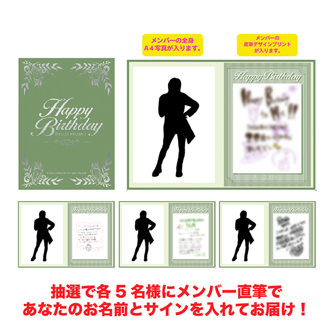 ![]() 抽選で50名様に特典プレゼント♪ 1月通信販売を合計¥8,000以上お買い上げの方の中から抽選で合計50名様に直筆サイン入りスタンド付L判生写真を抽選でプレゼント! 今回は・・・櫻井梨央、後藤花、入江里咲、豫風瑠乃、相馬優芽です! *厳正なる抽選の上、当選者の発表は発送をもってかえさせて頂きます。 *体調不良などにより活動に制限がかかったアーティストなどに関して、メンバー直筆の宛名とサインの抽選対象外となる場合がございますので、予めご了承の上お申し込みください。 |