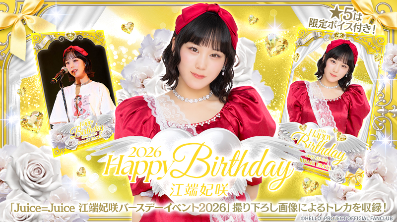Juice=Juice 江端妃咲バースデーイベント2026の模様を収めた撮り下ろし写真などを含むトレカによるカードパックです。