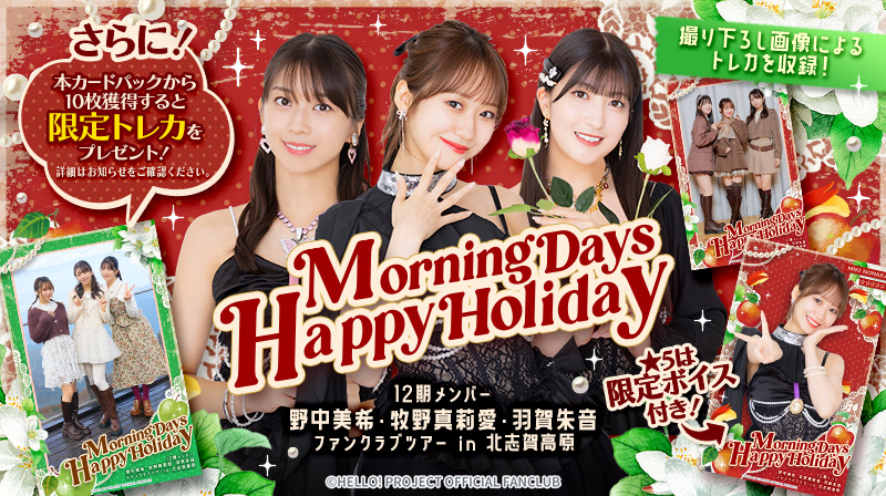 Morning Days Happy Holiday 12期メンバー 野中美希・牧野真莉愛・羽賀朱音ファンクラブツアー in 北志賀高原の模様を収めた撮り下ろし画像によるトレカを収録したカードパックです。