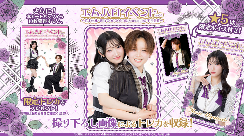 エムハロイベント vol.4 ~宮本佳林×BEYOOOOONDS/SeasoningS 平井美葉~の模様を収めた撮り下ろし画像によるトレカを収録したカードパックです。